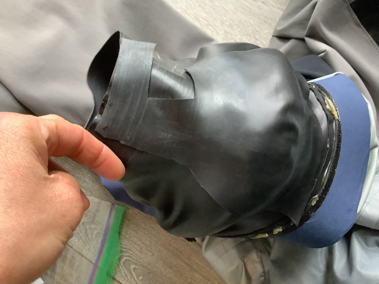 I was sliding my drysuit over my head last month, eager to get out for a Sunday paddle, when suddenly I felt the latex neck gasket give way… The result was what you see in the photo above: a 7.5-inch curving tear from neck opening almost to the base of the brand new gasket I had just installed the previous month. Sigh!