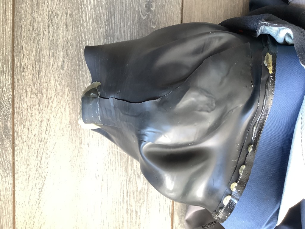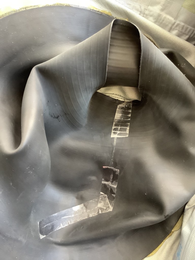 - EXTRA #2: After one or two uses, I had to reinforce the repair along the top edge of the gasket. There is a lot of “pull tension” here when the gasket is stretched over your head, and the repair was starting to pull apart in this spot (aka, “the spot where it all began”)! To fix that, I cut and glued a wider, oval-shaped piece of Tenacious Tape across the top edge of the repair (on the outside only) to provide a greater area of support around the top edge of the tear site. This additional repair has held well — although the edges of the extra patch are starting to come up now. Replacing or regluing that patch will lengthen the repair’s life.