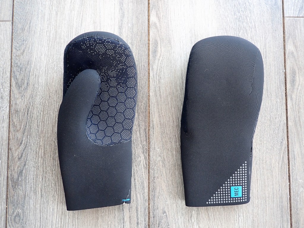 My 3mm neoprene mitts have a hydrophobic outer skin, which means water stays out unless my hands dip in the ocean over the cuff. In the past, I layered these mitts over my 3mm neoprene gloves, but I found the combination too restrictive: I couldn’t move my fingers freely, my hands turned into “claws,” I had to adapt my stroke, and I lost the feel of my paddle. That said, these mitts are very toasty: slip them on over wet gloves and painfully cold fingers are warm again within 10 minutes. Today, I carry these mitts as an emergency layer, or to loan to friends. I prefer my pogies-plus-gloves combo for warmth, comfort and functionality.
